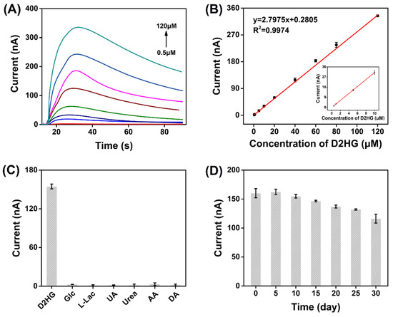 In order to obtain higher sensitivity and a wider linear range of the biosensor, the amounts of MXene, MB, and RsD2HGDH were further optimized. The i–t curves were applied to study electrochemical performance and the current responses of the biosensor with 50 μM D2HG under different preparation conditions were taken for comparison. Firstly, various amounts of MXene were applied to the biosensor (Figure S6A). With MXene amount increasing from 0.5 μg to 3 μg, the current response yields the maximum value at 1 μg. However, with the amount further increasing, the current response of the biosensor decreases gradually, which is attributed to the blockage of the electron transport path with excessive materials [40]. Next, the biosensors with different amounts of MB from 10 nmol to 100 nmol were analyzed (Figure S6B). With the increase of the amount of MB, the current response gradually increases and stabilizes until the amount of MB reaches 75 nmol, suggesting that the overloading of MB would barely boost the current signal of the biosensor. Finally, the optimal amount of RsD2HGDH was determined. As shown in Figure S6C, the maximum value appears when the amount of RsD2HGDH reaches 60 mU, and further increasing enzyme loading would cause the insulation effect of the enzyme membrane and hinder electron transfer and mass transfer processes at the electrode interface. Therefore, 1 μg MXene, 75 nmol MB, and 60 mU RsD2HGDH were chosen as the optimal preparation condition for the D2HG biosensor.