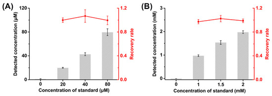 Recovery tests of (A) fetal bovine serum and (B) artificial urine.