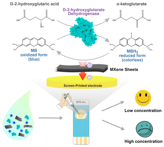Herein, we construct a portable and sensitive electrochemical enzymatic biosensor based on MXene for the analysis of D2HG (Scheme 1). RsD2HGDH, as the sensing element, and methylene blue (MB), as the electron mediator, are co-immobilized on the MXene sheets, which are further coated onto an AuSPE to fabricate the biosensor. In the presence of D2HG, RsD2HGDH catalyzes the dehydrogenation of D2HG to α-KG and the generated electrons are transferred to the electrode via MB. The oxidation current of MBH2 is captured at the appropriate potential and linearly correlates with the concentration of D2HG in the range of 0.5 μM to 120 μM, which include the typical value of D2HG in human serum and urine [41]. Meanwhile, the performance of biosensors is systematically evaluated. Furthermore, the detection of D2HG in fetal bovine serum and in artificial urine samples is successfully conducted, suggesting satisfactory accuracy and reproducibility of the biosensor.