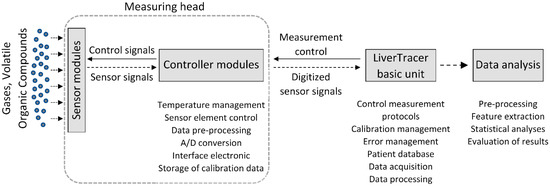In this study, a system called “LiverTracer” was developed. It is based on an e-nose system that detects changes in the VOCs from exhaled breath caused by liver dysfunctions and their severity. This system consists of a measuring head, which contains the sensor array, and a base unit for measurement control and data analysis (Figure 1).