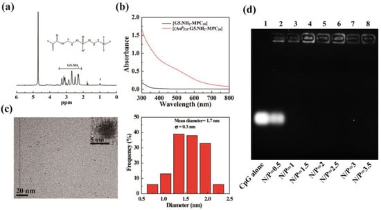 (a) 1H-NMR spectrum of Au DENPs-MPC. (b) UV/Vis absorption spectra of {G5.NH2-MPC20} and Au DENPs-MPC. (c) TEM image and size distribution histogram of Au DENPs-MPC. (d) Agarose gel electrophoresis of Au DENPs-MPC/CpG-ODN complexes at different N/P ratios (range from 0.5~3.5).