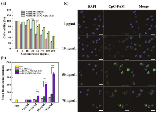(a) MTT assay results of the BMDCs cultured with Au DENPs-mPEG, Au DENPs-MPC alone, and Au DENPs-MPC/CpG-ODN complexes at different concentrations for 24 h. (b) Flow cytometry results of BMDCs cultured with CpG-ODN alone, Au DENPs-mPEG/CpG-ODN, and Au DENPs-MPC/CpG-ODN complexes at different concentrations for 4 h. (c) Confocal fluorescence images results of BMDCs cultured with Au DENPs-MPC/CpG-ODN complexes at concentration of 50 µg/mL. The scale bar is 20 µm. *** p < 0.001.