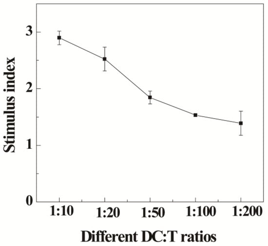 Next, the activation of T cells in vitro through mature BMDCs (mBMDCs) was checked. Firstly, we checked the purity of the extracted T cells according to our previous reports [43]. The flow cytometry detection results (Figure S4) showed that the expression of CD3 reached above 90%, suggesting high purity of the extracted T cells [43]. Then, the proliferation of T cells was detected by the allogeneic MLR setting [44]. It is clear that BMDCs matured by the Au DENPs-MPC/CpG-ODN complexes could activate the proliferation of allogeneic T cells at a DC/T ratio higher than 1:200, and the highest stimulus index was 2.8 times higher than that of the control group (T cells without stimulation) (Figure 4).