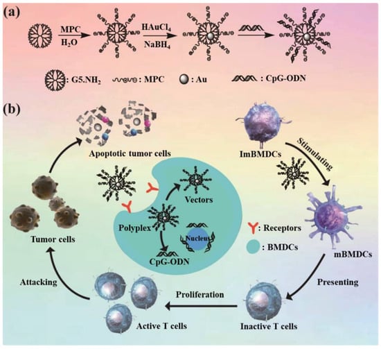 The following supporting information can be downloaded at https://www.mdpi.com/article/10.3390/bios12020071/s1, Table S1: Physicochemical parameters of the G5.NH2, {(Au0)25-G5.NH2-mPEG20}, and {(Au0)25-G5.NH2-MPC20} vectors. Table S2: Zeta potentials and hydrodynamic diameters of Au DENPs-MPC alone and the Au DENPs-MPC/CpG complexes at five different N/P ratios. Figure S1: Cellular uptake results of BMDCs detected by flow cytometry. Figure S2: The expression of CD11c on the surfaces of BMDCs related the purity of BMDCs was detected by flow cytometry. Figure S3: The inverted microscope images of mouse bone marrow-derived dendritic cells after induction for 1, 3, 5, and 7 days. Figure S4: The expression of CD3 on the surfaces of T cells related to the purity of T cells was detected by flow cytometry. Figure S5: The flow cytometry results of the expression of CD4 and CD8 on the surfaces of T cells. (a,b) T cells cultured for 3 days without stimulation. (c,d) T cells cultured with mBMDCs for 3 days. CD4 and CD8 were labeled with FITC (F1 channel).