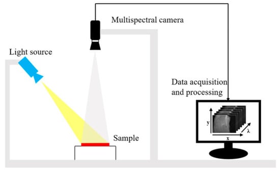A multispectral image is a collection of grey-scale images. Each corresponds to a specific wavelength or band of wavelengths in the electromagnetic spectrum [36]. MSI is a method of capturing images from different spectral bands with the aim of obtaining spatial and spectral information. Imagers based on MSI technology can provide wavelength channels in the near-UV, visible, near-IR, mid-IR and far-IR [37]. Thus, MSI can provide more information than RGB images. The acquired wavelength channels can be used directly for real-time applications in certain fields (e.g., fruit packing plants and food processing plants). A typical MSI system is shown in Figure 3. The system uses an adjustable focus lens to achieve high resolution imaging of 1290 × 960 pixels and has six bands, each covering a relatively wide range of wavelengths, which is strong for fast imaging [38].