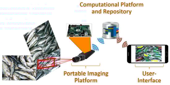 RGB imaging or MSI combined with convolutional neural network (CNN) can be effectively used for fish quality detection. For example, Park et al. [50] proposed an algorithm to classify fish by using CNN to train RGB images. The AlexNet-based network achieved good performance, with the shortest model training and execution time. Moreover, [3] demonstrated that the CNN model based on multispectral images showed acceptable performance in estimating the freshness of fish. A portable system was also built, as shown in Figure 4. Two CNN models established by fusing appearance and movement information successfully achieved automatic identification of the fish, with a best F score and mAP of 83.16% and 73.69%, respectively [91]. In addition, Yu, et al. [92] proposed a mask-based fish image segmentation and fish morphological feature metric scheme to pre-process and label fish images and feed them into a mask region convolutional neural network (Mask R-CNN) for training. Finally, the morphological features of fish were indexed, and the results showed that the method was able to segment fish in both pure and complex backgrounds with significant performance.