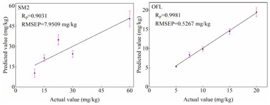 Plot of actual versus predicted values of SM2 and OFL residues in duck meat from predicted samples based on the peak height algorithm [98].