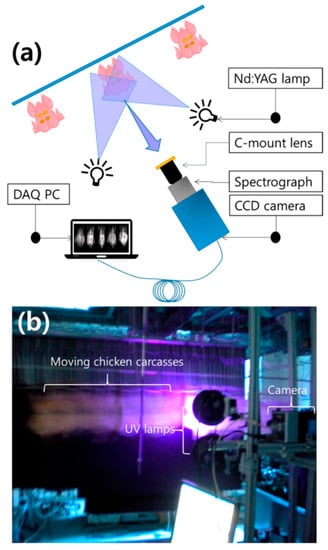 Schematic diagram of a multispectral fluorescence imaging system (a) and a real-time multispectral fluorescence imaging system (b) for the detection of fecal material on the surface of chickens [71].