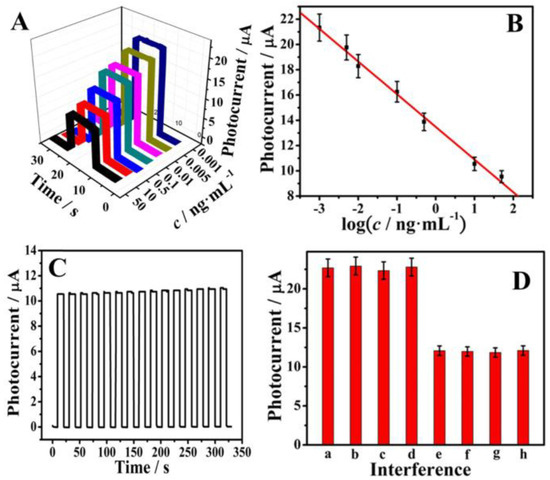 (A) Photocurrent response and (B) the logarithmic calibration curve for the sensor to detect cTnI in a concentration-dependent manner. (C) Photocurrent response of the sensor under 15 on/off illumination cycles for 320 s, concentration of cTnI = 10 ng/mL. (D) Selectivity of the sensor to detect cTnI: (a) Blank, (b) Blank + 100 ng/mL carcinoembryonic antigen, (c) Blank + 100 ng/mL squamous cell carcinoma antigen, (d) Blank + 100 ng/mL prostate-specific antigen, (e) 1 ng/mL cTnI, (f) 1 ng/mL cTnI + 100 ng/mL carcinoembryonic antigen, (g) 1 ng/mL cTnI + 100 ng/mL squamous cell carcinoma antigen, and (h) 1 ng/mL cTnI + 100 ng/mL prostate-specific antigen. Reprinted with permission from reference [44], copyright 2018 Elsevier.