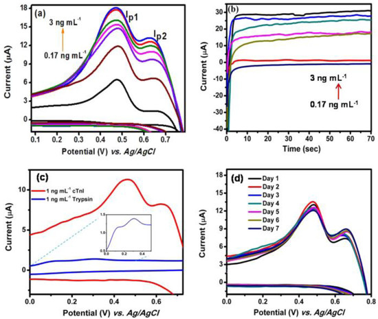 Antibody-free approaches based on biofunctionalized-GQDs-modified electrodes for electrochemical biosensors have recently gained attention. Antibody-free approaches could be cost efficient, stable, and involve straightforward protocols. In 2019, Lakshmanakumar et al. [45] used acetic acid-functionalized GQDs for the modification of a Au electrode for the electrochemical quantification of cTnI for the early detection of AMI with a sensitivity up to 3 ng/mL and a detection limit of 0.02 ng/mL. The coupling between the N-H group of cTnI and the COOH groups on the surface of the GQDs facilitated the sensitive detection of cTnI. Figure 3a shows the CV of the GQDs-modified Au electrode at different concentrations of cTnI. The oxidation peak currents were observed to rise with increased concentrations of cTnI (0.17 to 3.0 ng/mL). The detection limit of 0.02 ng/mL was associated with the conjugation of the functional groups of cTnI with the functional groups of the GQDs. Figure 3b displays a response time of 10 s. Figure 3c shows the anti-interfering capability of the sensor, where the CV reaction was documented in the presence of trypsin. Figure 3d validated the reproducibility of the sensor with a standard deviation of 3.1%. This study demonstrated an antibody-free approach for electrochemical biosensing of cTnI; additional validation of this approach is needed to facilitate use with human samples.