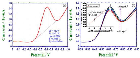 Tuteja et al. [46] described a label-free electrochemical sensor approach for the recognition of myoglobin by using GQDs on screen-printed electrode. The GQDs-modified electrode was further functionalized with anti-myoglobin antibodies in order to achieve the specificity of myoglobin. The charge-transfer resistance exhibited an increase from 0.20 to 0.31 kΩ in a linear manner over a concentration of 0.01–100 ng/mL myoglobin; a detection limit of 0.01 ng/mL was noted. The sensor showed specificity towards myoglobin when used with other proteins (e.g., CK-MB, hemoglobin, troponin I, avidin, and bovine serum albumin). The marked sensitivity of the sensor was attained by the immobilization of antibodies on the GQDs-modified electrode, which in turn accelerated the electron transfer of the sensor. Figure 4a shows the results of differential pulse voltammetry (DPV) analysis of the sensor in the presence of myoglobin. The peak at ~−0.62 V was reduced because of the decrease of the iron moiety existing in myoglobin. Figure 4b shows the decrease in current intensity with an increase in the concentration of myoglobin.