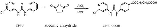 The hapten CPPU-COOH was synthesized by coupling succinic anhydride with CPPU via a one-step Friedel–Crafts reaction as previously described [23]. Briefly, DMF (5 mL) was dropwise added to anhydrous AlCl3 (6.75 g) under stirring at 0 °C. After the AlCl3 was completely dissolved, CPPU (1.24 g) and succinic anhydride (0.5 g) were added to the reaction mixture and stirred at 50 °C for 6 h. Next, the reaction mixture was poured into ice water (60 mL) with the addition of concentrated HCl (4 mL). The precipitate was collected and washed with distilled water to yield a raw product. After recrystallization in DMF/methanol, the hapten CPPU-COOH was obtained and identified by LC-MS and 1H NMR (Figure 1).