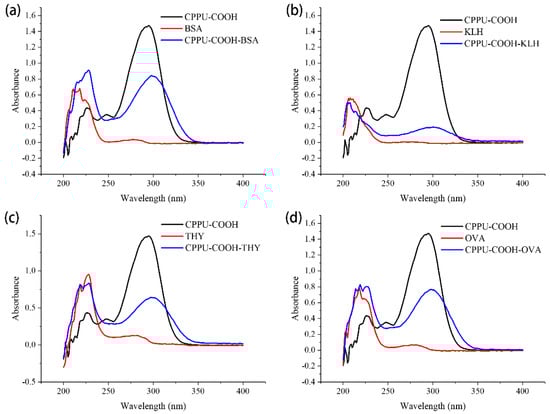 To produce a specific antibody, haptens should be coupled with proteins to form artificial antigens with both immunogenicity and immunoreactivity. BSA and OVA are commonly used proteins. In this study, BSA, KLH, and THY were selected as carriers and conjugated with CPPU hapten to obtain immunogens; BSA and OVA were chosen as substrates to obtain coating immunoreagents. The designed hapten CPPU-COOH contained a carboxyl group by which CPPU-COOH could be conjugated with amine groups in carrier proteins via the active ester method. The hapten–protein conjugates were characterized by UV spectrophotometry (Figure 2). As shown in Figure 2, CPPU-COOH has a characteristics absorption peak at 295 nm, whereas BSA, KLH, THY, and OVA displayed the characteristic absorption peak of proteins at ~280 nm. The obtained hapten–protein conjugates, CPPU-COOH-BSA, CPPU-COOH-KLH, CPPU-COOH-THY, and CPPU-COOH-OVA contained a distinct absorption peak at ~295 nm, which indicated that CPPU-COOH was successfully conjugated to the carrier protein [39].