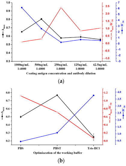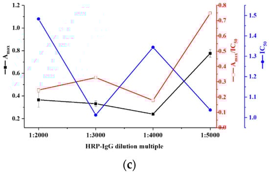 The optimized reaction conditions for icELISA (n = 3). (a) Concentration of coating antigen and antibody; (b) working buffer for the analyte; (c) IgG-HRP dilution multiple. The coating antigen at a concentration of 250 ng/mL, the antibody with a 1:8000 dilution (1 µg/mL), PBS as a dilution solution, and IgG-HRP diluted 1:5000 were chosen as the optimal working conditions.