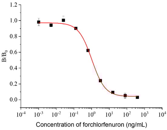 Standard curve for icELISA (n = 3). The IC50 for CPPU was 1.04 ng/mL, the LOD was 0.16 ng/mL, and the linear range was 0.31–3.43 ng/mL.