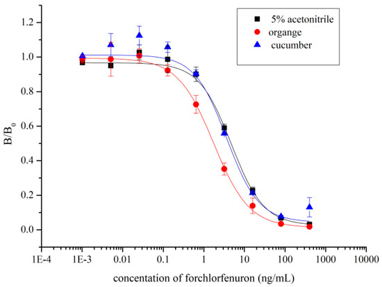 Generally, dilution of the sample can reduce the matrix effects on an immunoassay to a large extent [49,50]. In this study, spiked cucumber and orange samples were analyzed using icELISA. When diluted by PBS containing 5% acetonitrile to twenty-fold, the matrix effects were effectively eliminated (Figure 5).