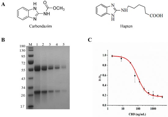 For the purpose of obtaining specific antibody to target CBD, hapten should preserve the parent structure of CBD, while a space arm with an active group is essential to maximumly exposure the parent structure. Previous studies showed that the molecular structure derived from aminobenzimidazole with a six-carbon-chain link arm was a good hapten to induce a specific antibody against CBD [48]. Moreover, the classical immunological study reveals that molecules smaller than 5000 Da are usually conjugated as haptens to large molecular weight carriers (usually proteins) to induce antibody formations [49]. BSA is an ideal carrier because of its relatively low price and abundant lysine residues [50]. Thus, we coupled the hapten to BSA as an immunogen (CBD-BSA). The maximum absorption peaks of the hapten, BSA, and artificial antigen were at 286 nm, 277 nm, and 282 nm, respectively (Figure S1A). The coupling ratio of CBD hapten to BSA was calculated at 27:1 by using MALDI-TOF (Figure S1B). These results indicated that the immunogen was successfully synthesized.