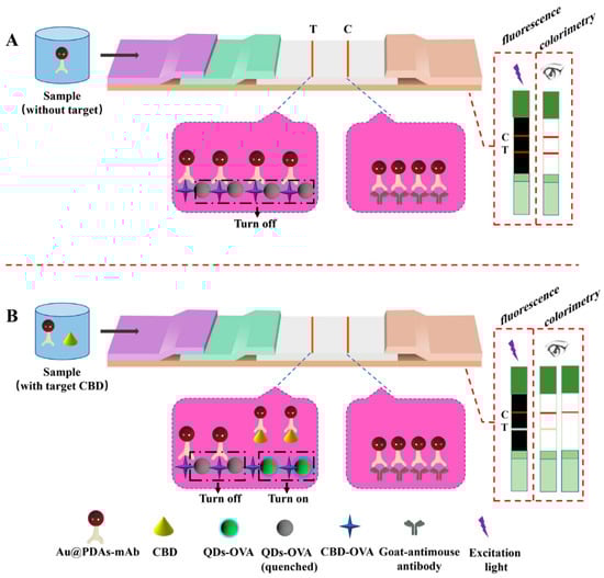 Principle of Au@PDAs-QDs-LFIA: (A) detection mode without target CBD; (B) detection mode with target CBD.