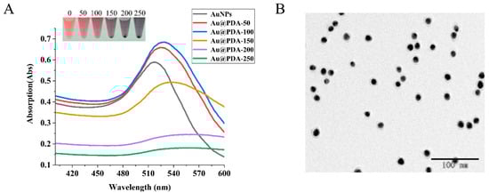 (A) UV–vis absorption spectra of AuNPs, Au@PDA-50, Au@PDA-100, Au@PDA-150, Au@PDA-200, and Au@PDA-250. (B) TEM image of Au@PDA-100.