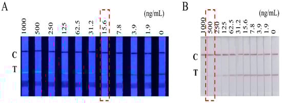 Under the optimized conditions, CBD was diluted with 5% methanol PBS to several concentrations, which were 1000, 500, 250, 125, 62.5, 31.2, 15.6, 7.8, 3.9, and 0 ng/mL. The test results showed that the cut-off value (the minimum CBD concentration that makes T line invisible) of CBD at the fluorescence mode under ultraviolet light was 15.6 ng/mL (Figure 4A). The detection cut-off value of CBD under natural light was 500 ng/mL (Figure 4B). In addition, we used ImageJ software to translate the band intensity to a quantitative value. Standard curves were built with good linear relation in both modes, and the LOD and linear range were, respectively, 1.36 ng/mL and 3.56–246.67 ng/mL for fluorescence mode, while the LOD and linear range were, respectively, 3.21 ng/mL and 7.21–945.55 ng/mL for colorimetry mode (the quantified graphs are not shown). The sensitivity of the assay was comparable to the sensitivity of reported immunodetection methods (Table S2).
