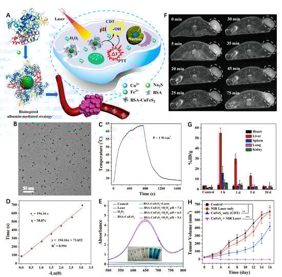 Copper sulfide (CuS) nanoparticles were shown to possess superior photoabsorption properties in the NIR region [59]. Therefore, the introduction of a CuS component to an Fe-based matrix is expected to enhance the curative effects of PTT/CDT. Chen et al. [60] employed a facile aqueous biomineralization strategy to synthesize ultrasmall bovine serum albumin (BSA)-modified chalcopyrite (BSA-CuFeS2) nanoparticles with a diameter around 4.9 nm and good dispersity, as well as biocompatibility (Figure 1A,B). Remarkably different from the classical pH-dependent Fenton reaction (i.e., generally energetic in a narrow pH range (e.g., pH = 3–4)), BSA-CuFeS2 was able to produce a comparable amount of •OH in varying pH conditions (7.4, 6.5 and 5.4) for CDT (Figure 1E). This pH-independent Fenton-like reaction of the BSA-CuFeS2, similar to Cu-based Fenton-like reactions, could work over a wide pH range, including neutral pH conditions. Combined with good photothermal effects (PCE = 38.8% at 808 nm), BSA-CuFeS2 produced a synergistic effect between PTT and CDT (Figure 1C,D). In contrast to the tumor volumes of the control group (~600 mm3), the tumor growth was apparently inhibited in the single CDT group, while the PTT/PDT group showed thorough tumor ablation after the treatment (Figure 1H). In addition, BSA-CuFeS2 was also an efficient T2-weighted MR imaging contrast agent (r2 = 5.06 mM−1 s−1) that caused a remarkable and quick decrease in the MR signal at the tumor site (Figure 1F). In order to identify the long-term biodistribution and clearance, the Cu concentrations in solubilized main organs were measured using inductively coupled plasma atomic emission spectrometry (ICP-AES) (Figure 1G). It was clear that the liver, spleen and kidney had a significant Cu uptake at 1 h post injection. After 5 days, the Cu concentration significantly decreased to 15 ± 4.7 and 3.3% ID/g in the liver and spleen, respectively, suggesting the body-clearable nature of BSA-CuFeS2 NPs. Notably, the Cu concentration in the kidney rapidly decreased and closed to the level of the control group after 5 days, revealing that the ultrasmall size of BSA-CuFeS2 NPs could lead to renal clearance.