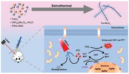 Chen et al. [61] also designed and characterized state-of-the-art biodegradable Fe-doped MoOx (FMO) nanowires using a one-step solvothermal method and then modified them to incorporate polyethylene glycol-4000 (PEG-4000). FMO, as an anti-tumor nanoagent, possessed a high PCE (48.5% at 808 nm) and demonstrated excellent magnetic performance for T1-weighted MR imaging due to the unpaired electrons of the Fe3+ ions (longitudinal relaxivity, r1 = 1.4107 mM−1 s−1). Moreover, FMO was capable of effectively catalyzing the decomposition of H2O2 to form •OH for enhanced CDT, accompanied by the consumption of GSH (Fe3+/Fe2+ and Mo5+/Mo6+ reduction). Importantly, FMO presented with excellent pH-dependent degradation, which is a behavior that encouraged rapid degradation at a physiologically relevant pH whilst also remaining relative stability at an acidic pH. The findings, therefore, suggested that FMO was highly biodegradable and would not promote long-term toxicity (Figure 2).