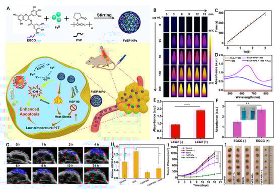 (A) Schematic detailing synthesis of the FeEP nanoplatform and illustrating its applications for mild PTT-enhanced CDT to promote tumor ablation. (B) Thermal images of FeEP with different concentrations (µg mL−1) under 808 nm laser irradiation (1 W cm−2, 15 min). (C) Fitted linear relationship between −ln θ and time. (D) UV-vis absorbance spectra of tetramethylbenzidine (TMB), H2O2 + TMB, FeEP + TMB and FeEP + H2O2 + TMB. (E) UV-vis absorbance of TMB at the wavelength of 652 nm after being co-incubated with FeEP and H2O2 together with and without laser irradiation. (F) UV-vis absorbance of TMB at the wavelength of 652 nm after incubation with Fe II + H2O2 or Fe II + H2O2 + EGCG. (*) p < 0.05, (**) p < 0.01 and (***) p < 0.001. (G) PA images of the tumor region from 4T1 tumor-bearing mice before and after intravenous injection of FeEP. (H) The relative HSP 90 expression level in 4T1 cells with different treatments. (I) The growth curves of tumor volumes of the mice after various treatments. (*) p < 0.05, (**) p < 0.01 and (***) p < 0.001. (J) Digital photography of the excised tumors from different mouse groups. Reprinted with permission from Ref. [63]. Copyright 2021, Elsevier Inc.