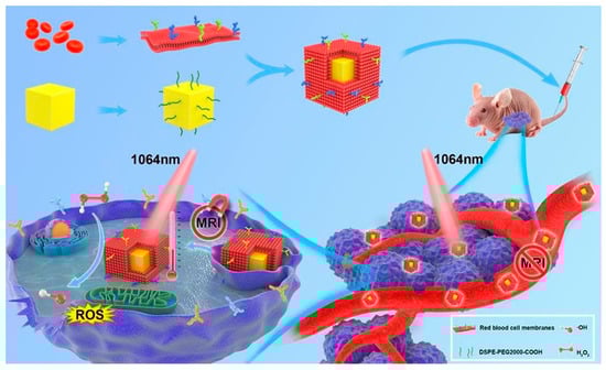A rationally designed red blood cell membrane (RBC)-coated FeS2 (FeS2@RBCs) nanoplatform was recently reported by She et al. [68] (Figure 4). The preparation procedure included the fabrication of FeS2-PEG, preparation of RBCs vesicles and fusion of RBCs on the surface of FeS2-PEG. According to the dynamic light scattering (DLS) results, the hydrodynamic size of FeS2@RBCs was measured to be 185.2 nm, which was slightly larger than that of FeS2-PEG (168.3 nm) owing to the RBCs coating. The obtained FeS2@RBCs possessed strong optical absorption within the NIR-II area, resulting in effective PTT-augmented CDT. Due to the specific surface properties of RBCs, the nanoplatform could effectively enter into the 4T1 cells with the extension of incubation time. Compared with the FeS2-PEG group (4.2% ID/g), the FeS2@RBCs group achieved significantly higher tumor accumulation with 8.7% ID/g at 6 h post injection. After 24 h post injection, the tumor accumulation of FeS2@RBCs was still higher than that of FeS2-PEG, which was attributed to the superior blood circulation. Notably, FeS2@RBCs exhibited obvious lower uptake by the liver and spleen in contrast to FeS2-PEG, revealing its immunity evasion capabilities. These results culminated in an enhancement in tumor accumulation and improved PTT (PCE = 30.2%) under 1064 nm laser irradiation. Moreover, CDT efficiency was improved through the increased generation of •OH that was brought about by the elevated temperature at the tumor site. This was demonstrated through the peroxidation of lipid, which was identifiable through the cell death pathway of CDT. In addition, FeS2@RBCs exhibited an elegant self-enhanced MR imaging ability after H2O2 treatment that could be used to guide the therapy. As anticipated, subcutaneous 4T1 breast tumor growth was remarkably inhibited with negligible side effects arising from the combined NIR-II PTT and CDT.