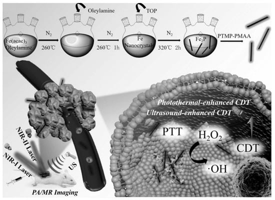 Liu et al. [69] fabricated novel one-dimensional (1D) Fe2P nanorods (NRs) that were fitted with a trithiol-terminated poly(methacrylic acid) (PTMP-PMAA) modification (FP NRs) in order to enhance hydrophilicity and biocompatibility. The FP NRs exhibited excellent photothermal effects (PCE = 56.6% at 1064 nm) and considerable Fenton effects. Interestingly, the Fenton reaction efficiency could be dramatically improved using PTT and with the assistance of ultrasound (US). Moreover, the FP NRs had a high impairment ratio, regardless of the limitations of depth and low-dose laser intensity. Additionally, an intrinsic photothermal conversion ability and magnetic property presented FP NRs as a noteworthy and promising new tool for enhancing dual-modal PA and MR imaging (r2 = 277.79 mM−1 s−1). Therapeutically, in vitro and in vivo experimental results demonstrated that FP NRs were effective as a treatment method for tumor ablation owing to the synergistic effect of NIR-II PTT and photothermal/US co-enhanced CDT (Figure 5).