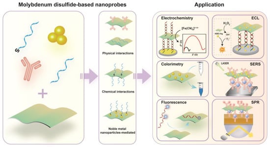 MoS2 is an emerging material star, which is a member of transition metal dichalcogenides. Due to its typical graphene-like layered nanostructure, MoS2 is also a potential candidate to construct the ideal nanoprobe due to its unique physical, chemical, and electronic properties, such as a large surface area, high conductivity, excellent quenching activity, accepted Raman enhancement effect and easy functionalization []. The recognition units or signal units assembled onto the MoS2 nanosheet to form MoS2-based nanoprobes, which exhibited a high molecular recognition ability, excellent chemical stability, accepted biocompatibility and a strong signal amplification effect. Moreover, MoS2-based nanoprobes easily coupled with other signal amplification strategies to further amplify detection performances, including sensitivity, selectivity, reproducibility, stability, etc. Inspired by the rapid development of MoS2-based nanoprobes in sensing application, it is necessary to summarize its exciting advances (Figure 1). From this review, we hope to offer some useful suggestions to new researchers in the sensing field.