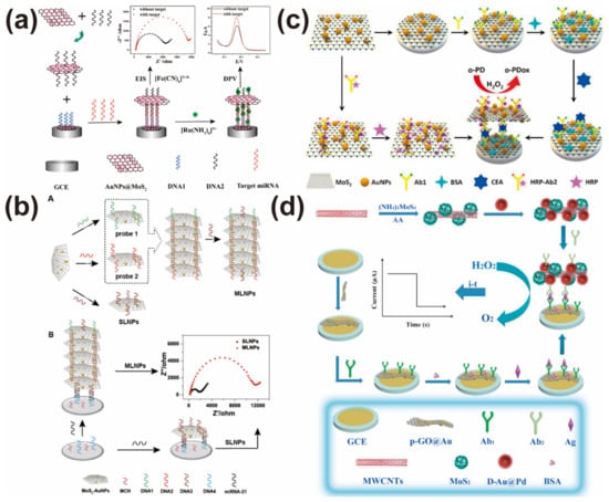 (a) Construction of dual-mode electrochemical sensor for miRNA-21 detection based on MoS2-based nanoprobes. Reprinted with permission from []. Copyright 2017, Elsevier. (b) Construction of multilayer MoS2-based nanoprobes for miRNA-21 analysis. Reprinted with permission from []. Copyright 2020, Royal Society of Chemistry. (c) Illustration of electrochemical immunosensor by coupling MoS2-based nanoprobe with triple signal amplification. Reprinted with permission from []. Copyright 2019, Elsevier. (d) Construction and application of MoS2-based nanoprobes for electrochemical analysis of HBeAg. Reprinted with permission from []. Copyright 2017, Elsevier.