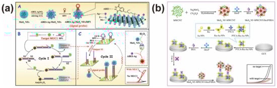A few layers of MoS2 the nanosheet possess a direct bandgap and a large surface. These properties made the MoS2-based nanoprobe a potential candidate to construct electrochemiluminescence (ECL) sensors. Usually, a MoS2-based nanoprobe is used as a co-reaction promoter to efficiently amplify the detection signal, called a “signal-on” detection mechanism. An example was offered by Li et al., who constructed a ECL sensor for mucin 1 (MUC1) analysis by coupling a target recycling signal amplification strategy and a MoS2-based nanoprobe []. The prepared MoS2 nanoflowers can heavily load N-(aminobutyl)-N-(ethylisoluminol) (ABEI)-decorated AgNPs as signal amplifiers, which can catalyze ABEI-H2O2 to improve the detection intensity. As shown in Figure 3a, the added MUC1 triggered the signal amplification process, leading to the designed ECL aptasensor having a wide linear range (1 fg mL−1 to 10 ng mL−1) and low detection limit (0.58 fg mL−1) for MUC1 determination. Another ECL MoS2-based nanoprobe was constructed by MoS2@Au nanocomposites []. With the assistance of exonuclease III-driven DNA walker, a sensitive ECL sensor was developed for 8.9 pM sialic acid-binding immunoglobulin (Ig)-like lectin 5 analysis.