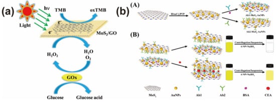 - Peng, J.; Weng, J. Enhanced Peroxidase-Like Activity of MoS2/Graphene Oxide Hybrid with Light Irradiation for Glucose Detection. Biosens. Bioelectron. 2017, 89, 652–658. [Google Scholar] [CrossRef]