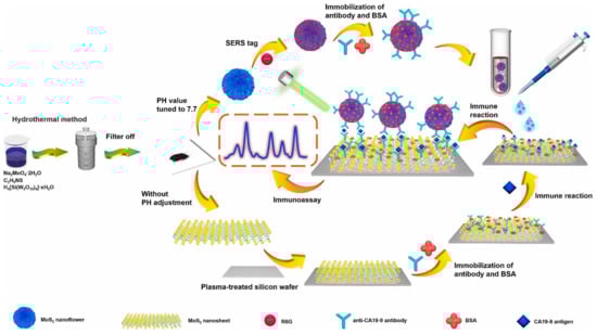 - Jiang, J.; Liu, H.; Li, X.; Chen, Y.; Gu, C.; Wei, G.; Zhou, J.; Jiang, T. Nonmetallic SERS-Based Immunosensor Byintegrating MoS2 Nanoflower and Nanosheet Towards the Direct Serum Detection of Carbohydrate Antigen 19-9. Biosens. Bioelectron. 2021, 193, 113481. [Google Scholar] [CrossRef] [PubMed]