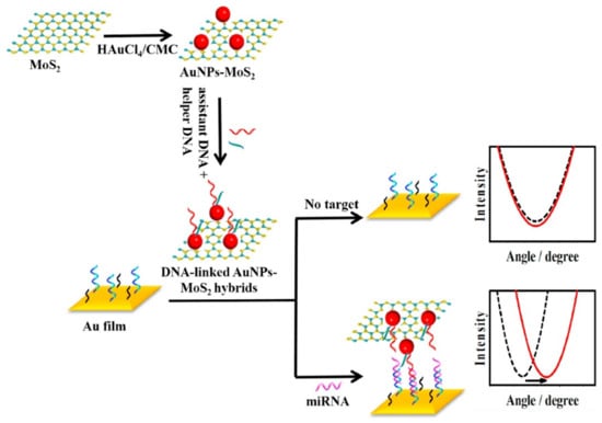 MoS2 and its nanocomposites have been considered as ideal substrates for the construction of SPR sensors due to the unique properties of a MoS2 nanosheet, such as high charge carrier mobility and easily functionalization of noble metal nanoparticles [,]. As expected, MoS2-based SPR sensors are widely used to rapidly, label-free detect biomolecules or real-time and in-situ monitor the biological reaction. For example, Chiu et al. assembled carboxyl-functionalized MoS2 sheets (MoS2-COOH) onto a gold surface to construct a SPR immunosensor for monitoring a bioaffinity interaction []. Experimental data showed that the SPR angles can be amplified by the MoS2-COOH chip, which was almost 1.9 folds and 3.1 folds than MoS2 and traditional SPR chips when the bovine serum albumin (BSA) concentration was 14.5 nM. Unfortunately, most of the works focused on the development of MoS2-based SPR substrates. To explore the potential application of a MoS2-based nanoprobe in SPR sensing field, Wang and co-workers developed a SPR biosensor for microRNA-141 (miRNA-141) analysis based on MoS2-AuNPs nanocomposites []. As shown in Figure 7, a classical sandwich structure was formed in the presence of miRNA-141. The localized plasmon of AuNPs supported onto MoS2 nanosheets easily generated the electronic coupling by associating with Au film. As a result, an ultralow detection limit of 0.5 fM for miRNA-141 detection was obtained due to this signal amplification effect. Moreover, this designed SRP biosensor exhibited high selectivity for miRNA-200 family members’ determination.