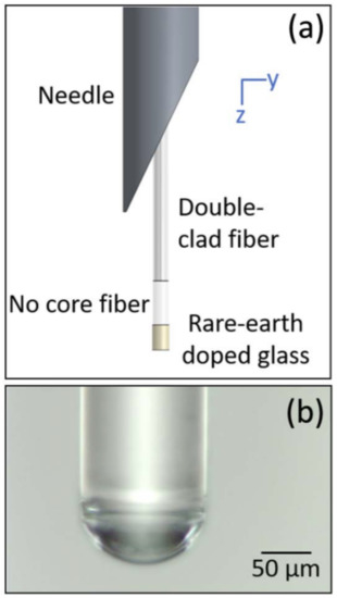 Needle probe for temperature sensing. Top (a): a DCF-based catheter coming out of a needle. Bottom (b): microscopic image of the probe tip with a curved focusing element. Images reprinted with permissions from ref. [44]. Copyright 2018 Optica.