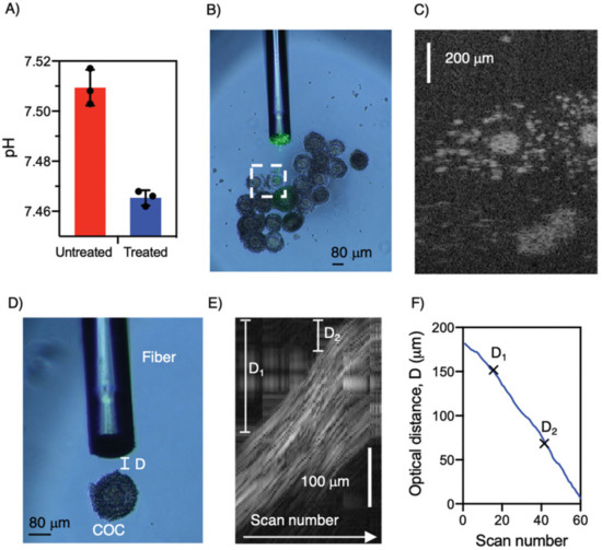 DCF-based OCT+pH probe for combined OCT and pH analysis of cumulus-oocyte complex. (A) pH measurements for untreated and treated oocytes. (B) OCT+pH probe near oocytes with OCT field of view in white box. (C) OCT image of oocytes. (D) OCT+pH probe near single oocyte. (E) Composite OCT scan series of oocyte with decreasing optical distance D between probe and target. (F) Number of scans versus optical distance for composite image showcased in (E). Image reprinted with permissions from ref. [47]. Copyright 2021 Wiley-VCH GmbH.
