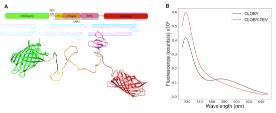 Figure 1A shows a schematic representation of the CLOBY biosensor. The fluorescent proteins mClover3 and mRuby3 were chosen as they form an optimal FRET pair with a Förster radius of 6.5 nm, high photostability and brightness []. mClover 3 with an N-terminal histidine tag to facilitate protein purification and a spacer at its C-terminus was fused to the SH4 domain. mRuby3 was fused to the C-terminus of the SH3 domain through a flexible spacer. A TEV protease cleavage site was included in the spacer between mClover3 and the SH4 domain to provide a control with an identical mixture of the two disconnected fluorescent proteins for each preparation of the biosensor. This is important as a recurring problem when using fluorescent proteins is the slow maturation of the chromophore that starts after the protein is folded. Maturation of red fluorescent proteins can be especially slow introducing a possible reproducibility problem []. The TEV-treated control contains a control mixture of proteins with the same maturation level as the matching CLOBY sample.