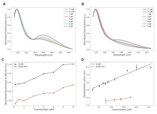 Concentration dependence of the normalized fluorescence of CLOBY (A) and TEV-treated CLOBY (B). The comparison of CLOBY and CLOBY-TEV presented in panel (C) highlights that the intermolecular FRET in the two samples is the same, and that intramolecular FRET dominates the fluorescence spectra at the 1 μM concentration used for screening experiments. The hydrodynamic radius measured by dynamic light scattering (D) at much higher concentrations (up to 275 μM for intact CLOBY) is also concentration dependent and provides an estimated dimer dissociation constant of 0.7 mM, confirming that self-association is negligeable at the working concentrations used in this study.