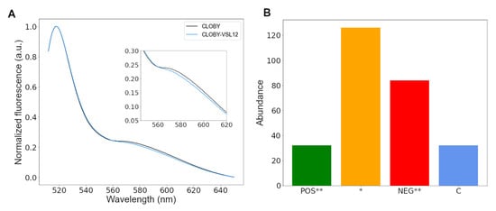 (A) CLOBY FRET is decreased in the presence of the VLS12 peptide, known to disturb the fuzzy complex of the SNRE. (B) Statistics of the first screening results based on fluorescence changes at 530 nm. Green and red bars represent the number of compounds increasing or decreasing the fluorescence by more than 3 standard deviations (indicated by **), respectively, only in intact CLOBY. The blue bar corresponds to colored compounds that could not be analyzed in the high-throughput assay. Orange bar corresponds to compounds with an effect (positive or negative) between one and two standard deviations (indicated by *).