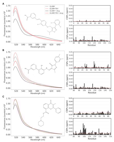 NMR validation of FRET results. Representative results of the three classes of hits defined by comparing fluorescence data and NMR perturbations. In each panel the fluorescence of CLOBY and CLOBY-TEV (at 1 μM concentration), in the presence or in the absence of excess drug (100 μM) are shown in the left. Chemical shift perturbations caused by the drug in the isolated SNRE, i.e., in the absence of the fluorescent proteins, are shown in the right. The effect on the disordered region (at 278 K) is shown on top and that that on the SH3 domain (at 298 K) are shown below. (A): GW4064; (B): Eltrombopag; (C): Flavoxate.