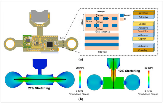To maintain wearability and convenience for continuous and long-term physiological monitoring, a flexible biosensor patch must be fabricated with a compact size (<0.1 mm) and light weight (<5.0 g). This ensures maximum comfort and stability for long-term use on the curved skin surface of the chest. The overall layout of the vital patch was designed using an FPCB with double layers and mounted components (Figure 2a). The structure of a single-layer FPCB includes a thin film with four main classes of materials (i.e., base material, electrical conductors, cover lay, and adhesive material). For monitoring while attached to the skin, the mechanical properties and performance must be investigated to ensure the stretchability and compatibility of the flexible device on the curved surface of the skin. Furthermore, with high stretchability and soft mechanical properties, interfaces and interactions of the flexible device with the skin are minimal. Thus, skin irritation and discomfort due to long-term wearability can be prevented. For this study, SolidWorks (version 2020, SOLIDWORKS Corp., Waltham, MA, USA) was used to simulate and analyze the strain distribution of flexible biosensor patches. The mechanical performance of the device was quantified by the deformation capacity, which is expressed as the stretch ratio when the device is subjected to significant deformation. In the first case, two concentrated forces were applied at each end in the longitudinal direction of the device. Similarly, two concentrated forces applied at each end in the transverse direction were considered for the second case. It has been proven that 20 kPa is the threshold for sensory perception [34,35]. Therefore, the magnitude of the applied forces was optimized so that the stress values were 20 kPa for all cases to evaluate the degree of comfort of the device. Simulated results are shown in Figure 2b. The extreme scenarios of the stretch ratios are 21% and 12% for the first and second cases, respectively, indicating that the device could cause irritation and discomfort at the interface only if the device is subjected to very large deformations that are a departure from the normal operating status of the device. In conclusion, the flexible design of the biosensor patch ensures a high level of compatibility and stability with the skin surface for long-term attachment.