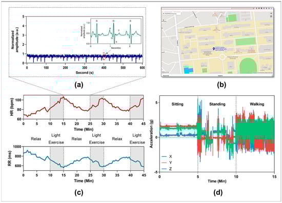 Representative data were collected by the proposed vital patch device. (a) Representative ECG waveforms were collected from one subject in 10 min. (b) Representative GPS position of one subject based on using the proposed monitoring device. (c) Monitoring heart rate and RR value of one subject with different light exercise sessions. (d) x-, y-, and z-axis accelerometry signals recording from one subject with different daily activities.