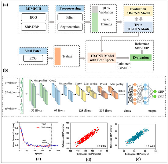 Overview of proposed BP estimation method using single-channel ECG. (a) Overview of the proposed BP estimation method. (b) The architecture and structure of 1D-CNN. (c) Performance of the proposed neural network with mean squared error. (d) Correlation plots of estimated SBP with reference SBP. (e) Correlation plots of estimated DBP with reference DBP.