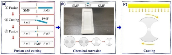 Figure 1 shows the manufacturing process of the H-shaped optical fiber. First, we fused the PMF with the single-mode fiber (SMF), then accurately cut the PMF under the optical amplification system [26] to ensure that the PMF of a specific length remained connected to the SMF, and finally connected another SMF to the PMF, as shown in Figure 1a. The cladding alignment mode was used in the fusion process to ensure that the fiber fusion could be carried out unimpeded. After the optical fiber fusion, these fibers were placed in a customized groove and we ensured that the PMF was in the middle of the groove, as shown in Figure 1b. After fixing the optical fiber, hydrofluoric acid with 40% concentration could be dropped into the groove to start the fiber corrosion. Figure 1b also shows the change process of the PMF end face during corrosion, finally becoming the H-shaped optical fiber. Figure 1c shows the schematic diagram of the H-shaped optical fiber coating process after corrosion. In the experiment, the rotation function of the optical fiber sample table of the magnetron-sputtering coating instrument was used to rotate the optical fiber along the optical axis, so that the surface of the H-shaped optical fiber could be evenly coated with metal film. During coating, the current and air pressure of the coating instrument were set to 40 mA and 2.0 Pa, respectively. Under this setting, the coating time increased by one minute, and the thickness of gold film on the surface of optical fiber increased by about 3 nm.
