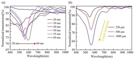 (a) Transmission spectra of H-shaped optical fiber with different gold film thicknesses. The length and remaining thickness of these fibers are consistent, at 500 μm and 0 μm, respectively. (b) Transmission spectra of H-shaped optical fiber with different lengths. The gold film thickness and remaining thickness of these fibers are consistent, at 50 nm and 0 μm, respectively.