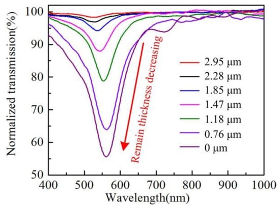 Transmission spectra of H-shaped optical fiber with different remaining thickness. The length of the corroded PMF contained in these fibers is 1000 μm.