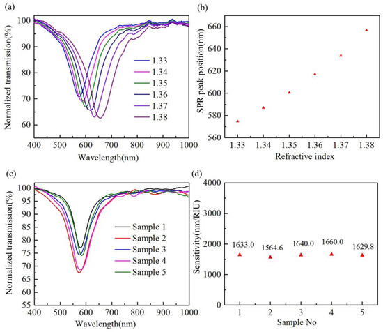 One advantage of the chemical etching method is that it can easily process multiple samples at the same time, and the characteristics of batch preparation are key to the large-scale application of the sensor. In order to verify the sensitivity consistency of the sensor, five PMF were corroded at the same time in a single corrosion experiment. After the corrosion, these fibers were coated and their spectra tested. Figure 5c shows that there are differences in the resonance peak intensities of different fibers. This may be mainly due to the slight difference in the remaining thickness after corrosion caused by the difference in the transverse structure of PMF in the samples, which results in different SPR excitation intensities of different fibers. The difference in resonant peak wavelength is mainly caused by the difference in gold film thickness between H-shaped optical fibers. Figure 3a shows that the gold film thickness has a significant impact on the position of the resonance peak of the H-shaped optical fiber. However, due to the coating technology, it is difficult to ensure that the gold film thickness between fibers is completely consistent. The refractive index responses of the five fibers were measured. Figure 5d shows that the refractive index sensitivity values of the fibers have good consistency. The average refractive index sensitivity of the five H-shaped optical fibers is 1625.48 nm/RIU and the maximum sensitivity error is 3.74%.