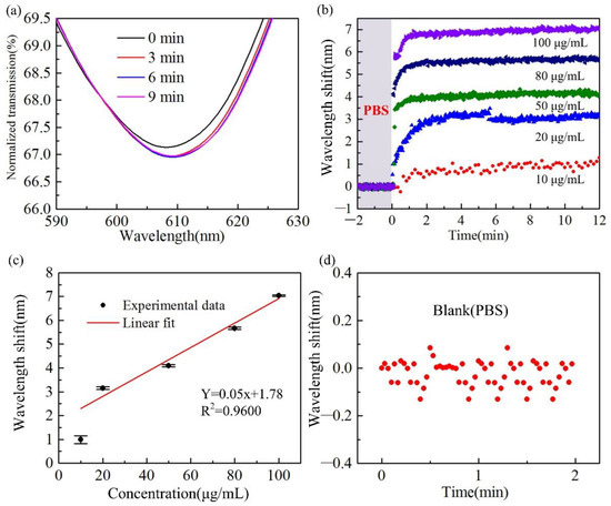 The changes in the transmission spectrum of the H-shaped optical fiber sensor in the process of detecting different concentrations of human IgG are shown in Figure 8. Before each test, the optical fiber was washed with PBS buffer, and the position of the resonant peak in PBS was used as a reference. When the solution to be tested flows across the sensing area, the transmission spectrum shifts toward longer wavelengths gradually. This is due to the surrounding refractive index increasing the fiber induced by the background solution and the combination of human IgG and goat anti-human IgG at the fiber surface. Figure 8a shows the change in the H-shaped optical fiber spectrum when testing 10 μg/mL concentration human IgG solution. It shows a spectrum shift to the long wavelength direction. Figure 8b shows the relative shift of the resonant peak wavelength with the increase in time when human IgG solutions with different concentrations are tested. This shows that the sensor takes longer to complete the specific binding of human IgG and goat anti-human IgG at low concentrations. When a high concentration human IgG solution enters the sensing area, the spectrum of the H-shaped optical fiber will shift greatly within a few seconds; then, due to the high concentration of human IgG, the spectral shift caused by specific binding can be completed in less than three minutes. The resonant wavelength responses to the change in human IgG concentration are represented in Figure 8c. The black dots represent the relationship between the resonant wavelength shift and the human IgG concentration, and the red solid line proves the calibration curve (R2 = 0.9600). The sensor sensitivity is calculated to be 0.05 nm/(μg/mL) according to the slopes of fitting lines. Figure 8d presents the wavelength shifts of the sensor in PBS 2 min, according to which the mean of wavelength shift (∆λblank) and the standard deviation (σ) were determined to be 0.02 nm and 0.05 nm, respectively. The LOD was calculated as 3.4 μg/mL by the formula of CLOD = f−1(∆λblank + 3σ), described in previous research [30,31], where f−1 is the inverse of the fitting function.