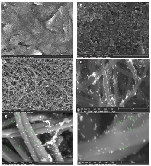 (A,B) SEM images of the CSPE and (C–F) CSPE/CNFs–AuNPs.